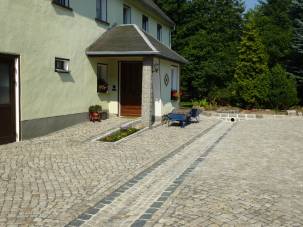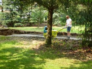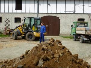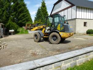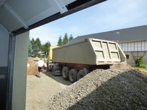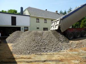Beginn der Aushubarbeiten für die Flächenbefestigungen. Die Aushubmassen werden abtransportiert und entsorgt. Zeitgleich erfolgt der Einbau der Frostschutzschicht 0-45mm aus gebrochenem Hartgestein (Grauwacke). Da es sich bei dem anstehenden Boden um ein sehr nässeempfliches Material handelt, muß unmittelbar nach dem Aushub die erste Lage Frostschutzmaterial eingebaut und verdichtet werden, um den Boden vor Durchfeuchtung zu schützen!